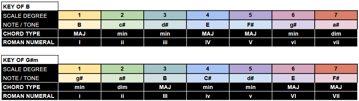 KEY OF B MAJOR : B , C# , D# , E , F# , G# , A# / KEY OF G# MINOR : G# , A# , B , C# , D# , E , F#