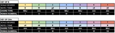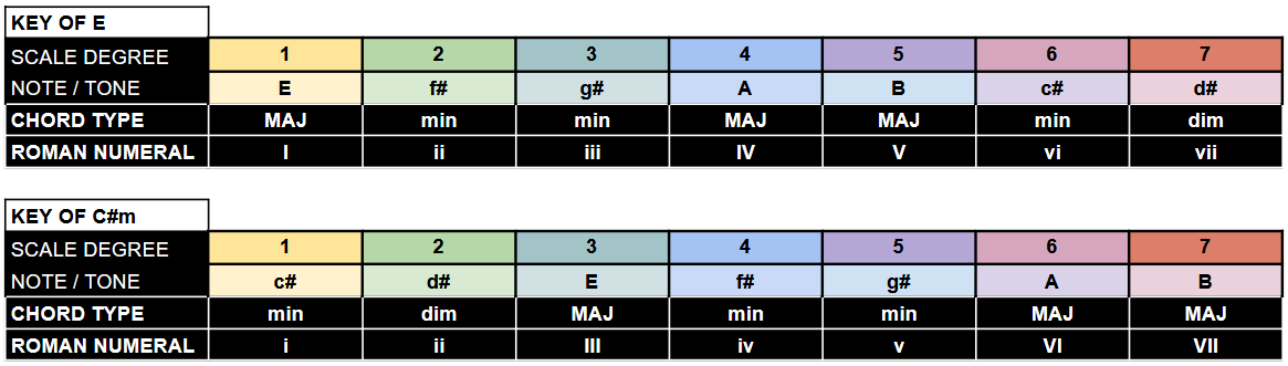 KEY OF E MAJOR : E , F# , G# , A , B , C# , D# / KEY OF C# MINOR : C# , D# , E , F# , G# , A , B