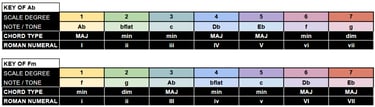 KEY OF Ab MAJOR : Ab , Bb , C , Db , Eb , F , G / KEY OF F MINOR : F , G , Ab , Bb , C , Db , Eb , F , G