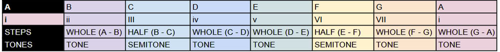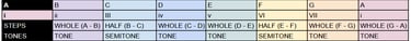 A (WHOLE STEP) B (HALF STEP) C (WHOLE STEP) D (WHOLE STEP) E (HALF STEP) F (WHOLE STEP) G (WHOLE STEP) A