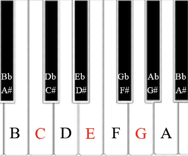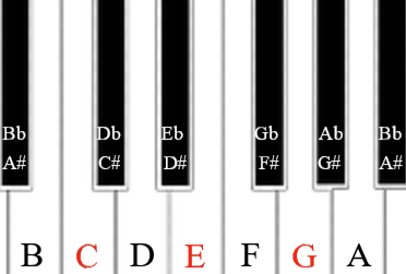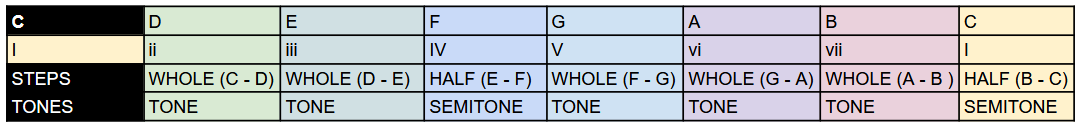C (WHOLE STEP) D (WHOLE STEP) E (HALF STEP) F (WHOLE STEP) G (WHOLE STEP) A (WHOLE STEP) B (HALF STEP) C