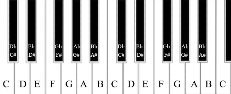 A, A#/Bb, B, C, C#/Db, D, D#/Eb, E, F, F#/Gb, G, G#/Ab.